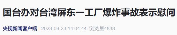 國(guó)務(wù)院臺(tái)辦發(fā)言人陳斌華23日表示,驚悉昨日下午臺(tái)灣屏東一工廠(chǎng)發(fā)生爆炸,造成多人傷亡。謹(jǐn)向遇難同胞表示深切哀悼,對(duì)遇難者家屬和受傷同胞表示誠(chéng)摯慰問(wèn)。